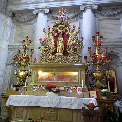 Siinä hän makaa, pyhä Lucia lasiarkussaan Santi Geremia e Lucia -kirkossa Venetsiassa. Konsertoimme kuoromme kanssa kirkossa viime keväänä, ja nappasin kuvan, vaikka se taisi olla kiellettyä. En haluaisi loukata katolilaisia, mutta tuohon kokonaisuuteen on ainakin minun, epäileväisen luterilaisen, vaikea suhtautua. Mieleen tulee ihan muuta kuin mitä ilmeisesti olisi tarkoitus.